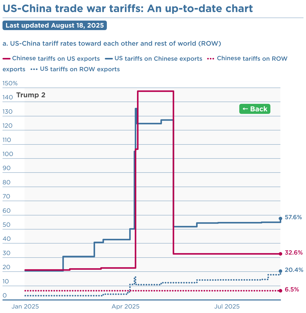 Bown, Chad P. “US-China Trade War Tariffs: An Up-to-Date Chart.” Peterson Institute for International Economics, 2025, https://www.piie.com/research/piie-charts/2019/us-china-trade-war-tariffs-date-chart. Accessed 25 August 2025.